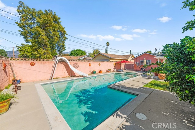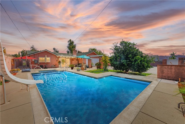 Step outside to your private backyard retreat, complete with a sparkling pool and spa, mature landscaping, and fruit trees including pomegranate and orange that add charm and seasonal color. The expansive lot provides generous outdoor space, while rear alley access offers convenience and additional parking options.