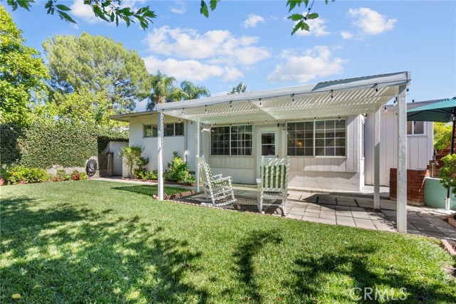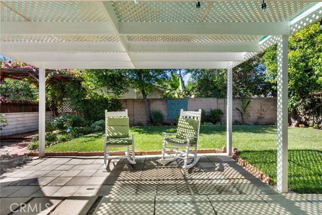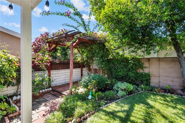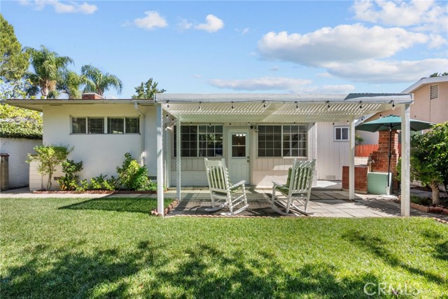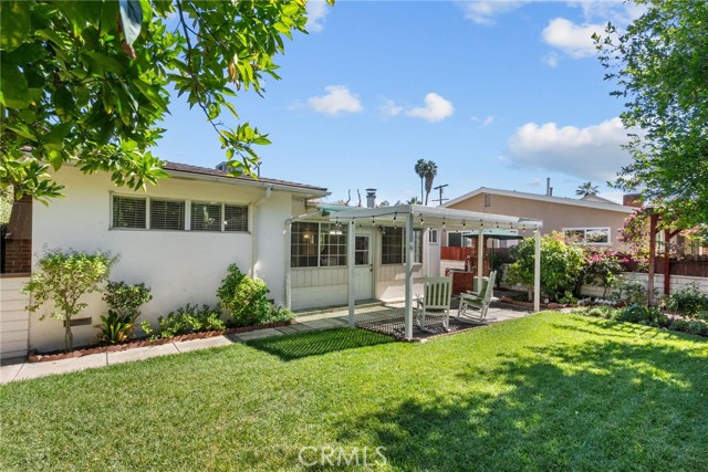 Out back, discover the meticulously manicured outdoor sanctuary featuring a lush grassy yard framed by mature greenery, a delightful pergola adorned by deep-purple Bougainvillea, a majestic orange tree, and a covered patio ideal for outdoor dining and weekend gatherings.