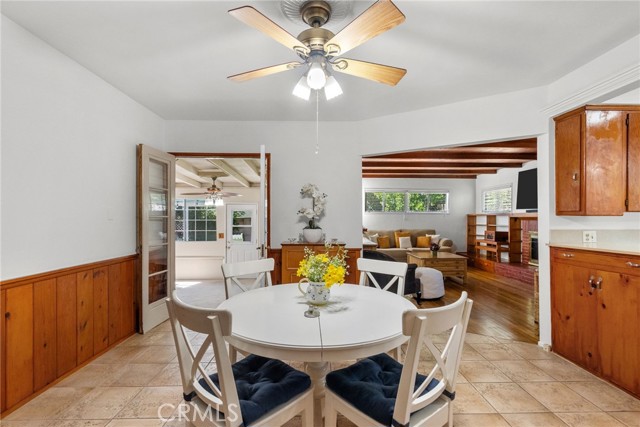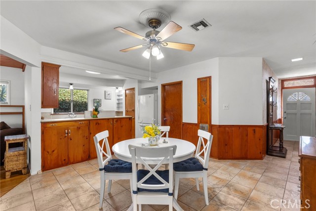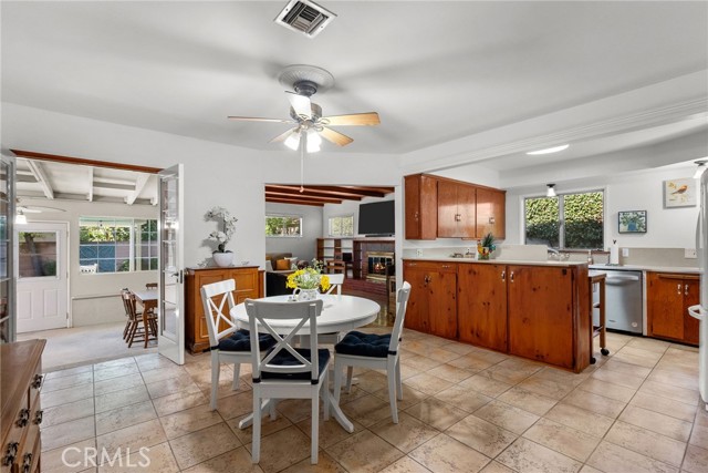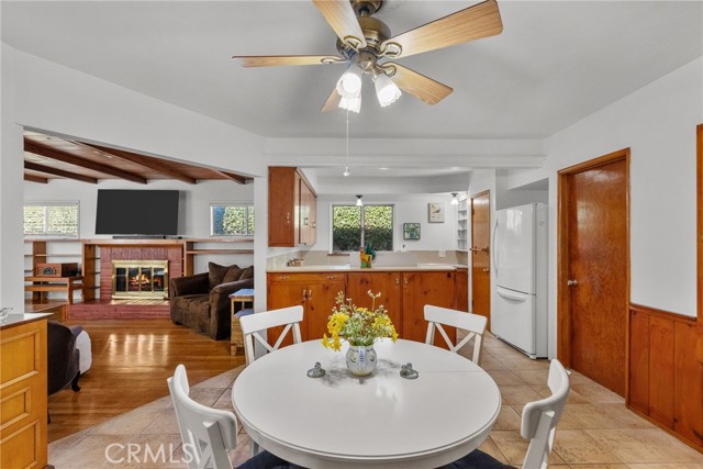 Step Inside, sunlight dances across warm hardwood floors, highlighting a spacious living room with rich tongue-and-groove wood ceilings and a brick-trimmed fireplace that instantly feels like home. The open dining area flows effortlessly into a bright country-vintage inspired kitchen with custom solid-wood cabinetry, and a layout that invites conversation while cooking.