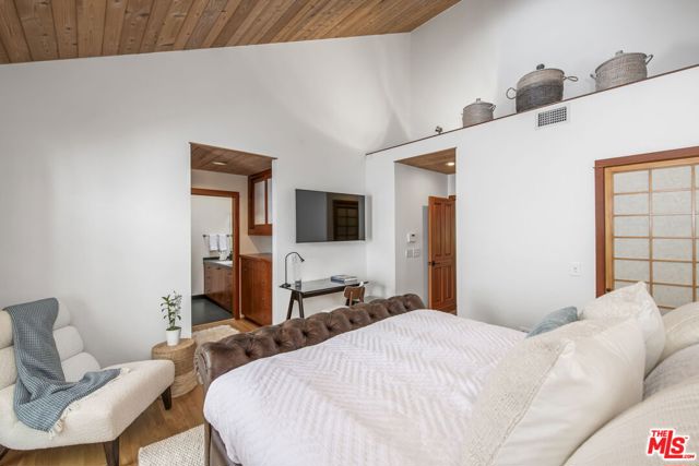 Set within coveted Rustic Canyon, this furnished estate presents a rare opportunity to experience refined living surrounded by natural beauty. Positioned on an expansive, private lot, the property consists of an elegantly designed main residence, a detached guest house, and a separate studio/office/gym with its own entrance and half bath. A large swimmer's pool anchors the outdoor experience, creating a true retreat for relaxation and sophisticated entertaining. The main residence welcomes you with soaring ceilings, walls of glass, and charming woodwork that frame the dramatic surrounding landscape. Sunlight fills the open layout, highlighting curated furnishings and high-quality finishes. The gourmet kitchen offers premium stainless steel appliances, custom cabinetry, and an impressive center island. The dining area blends seamlessly into the living room, where a sleek fireplace and expansive windows create a serene yet luxurious atmosphere. The primary suite is designed as a sanctuary, featuring a spa-inspired bathroom with a soaking tub and a spacious walk-in shower. Two additional bedrooms and a bath extend the home's comfort and livability. The detached guest house offers a refined private space with its own bedroom, full bathroom, and kitchenette ideal for extended stays or private work quarters. Outdoors, the compound truly shines. Multiple patios welcome al fresco dining and peaceful lounging, and a large outdoor living area is set against a spectacular, 18 ft fountain stream. Seating on the pool deck provides views of the majestic Eucalyptus trees above and the lush canyon below. Additional features include a large garage, generous off-street parking, and convenient access to coastal amenities, hiking trails, Montana Ave, and downtown Santa Monica. A truly exceptional offering, this Rustic Canyon retreat blends luxury, design, and nature into one elevated living experience. Owner is looking for an 18 month lease but willing to negotiate.