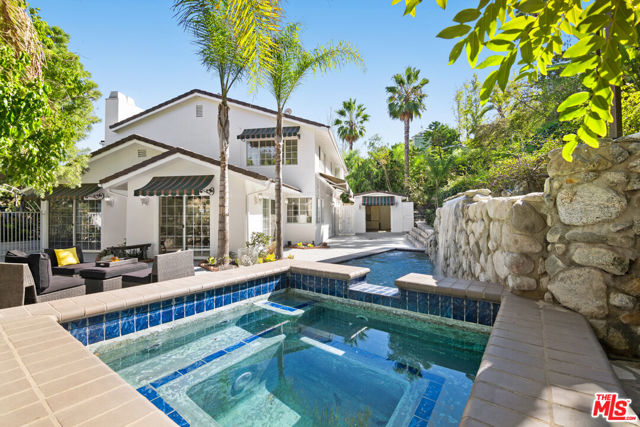 This exquisite newly renovated 5 bdrm 4.5 bath home offers privacy, and luxury living at its finest! Nestled in the hills but minutes to the studios, downtown, the westside, and the valley. Gorgeous brand-new chef's kitchen, fully appointed master suite with an amazing view, a fireplace, a walk-in closet, and a striking bathroom. The guest suite is accessible from inside the main house, and the outside staircase can be permitted under the new ADU (Additional Dwelling Unit), law. Additionally, there is a separate, detached free-standing office. An open floorplan is an entertainer's dream. Outside offers mature lush tropical landscaping, pool, hot tub, fountain, and waterfall over the plunge pool. Available now. Welcome, Home!!