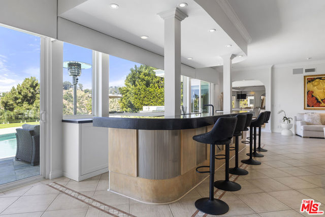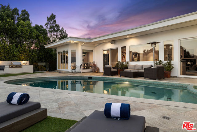 Situated in the Hollywood Hills above the Sunset Strip, this furnished contemporary single-level home captures unobstructed panoramic views from the city to the ocean. Built in 1982 and thoughtfully updated in 2023, the 6,259 sq ft residence exudes modern elegance with luxurious finishes throughout. The home features an updated chef's kitchen, four en-suite bedrooms, a gym, home office & formal living and dining rooms. An open-concept floor plan seamlessly connects the living, dining & kitchen areas, creating a spacious & inviting environment. The interiors are tastefully furnished with sleek lines, refined decor & premium materials, embodying true contemporary luxury. Expansive glass sliding doors open to a stunning outdoor oasis. A sparkling pool invites you to unwind while taking in sweeping views of the city & Hollywood Hills. Lounge poolside, bask in the California sun, enjoy alfresco dining, or perfect your putt on the private greenthe outdoor space is designed for relaxation & entertaining. Each en-suite bedroom is thoughtfully appointed with plush bedding & natural light, offering restful comfort. The primary suite features a generous sitting area, custom built-ins, dual walk-in closets & a spa-like travertine bath with a soaking tub, steam shower & sauna. Located in the coveted Mount Olympus community, this home offers privacy & tranquility while being just minutes from the world-class dining, shopping & entertainment of West Hollywood and Beverly Hills.