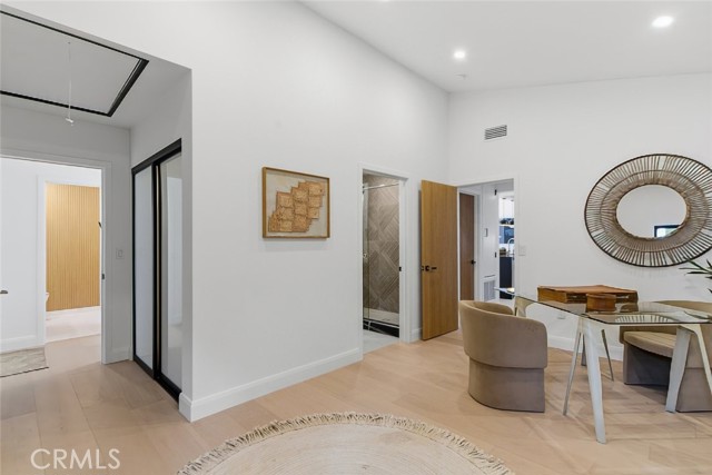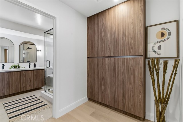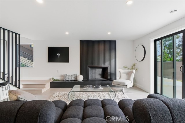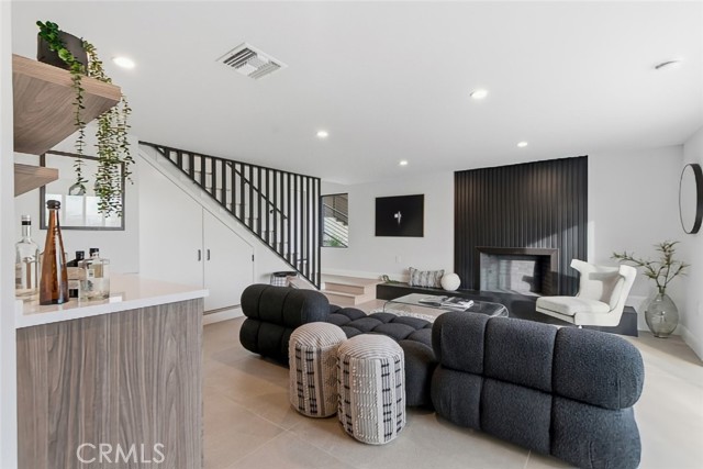 A spacious downstairs family room offers flexible use and can easily function as a fifth bedroom, guest suite, or home office. This space provides direct access to the backyard, creating effortless connectivity to the outdoor living areas.